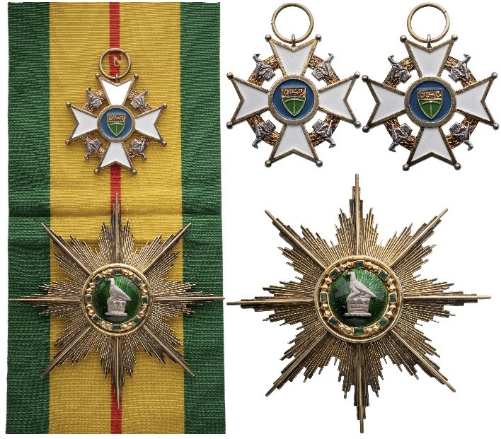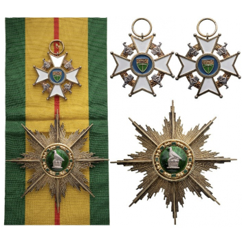 Grand Cross Set Civil (CLM), 1st Class. Sash Badge, 49x48 mm, gilt Silver, white enameled cross, obverse centre medallion blue enameled, round suspension ring and original short sash. Breast Star, 100 mm., gilt Silver, center enameled, two suspnsion hooks on reverse. An extremely rare and beautifully made set, in mint condition! I RR!