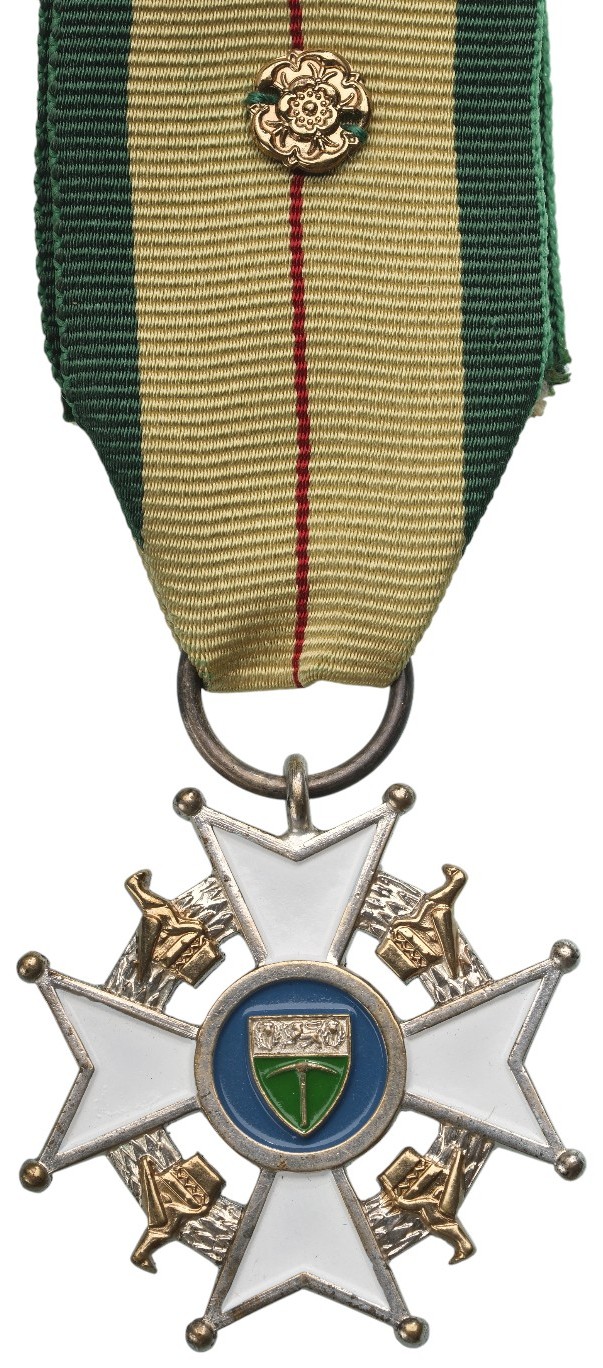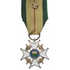 Knight's Cross Military (MLM), 5th Class. Breast Badge, 39x36 mm, Silver, white enameled cross, obverse centre medallion blue enameled, round suspension ring and original ribbon with gilt Silver rosette. A rare and beautifully made piece, in mint condition! I R!