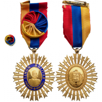 Officer's Cross, instituted in 1980. Breast Badge, 58x46 mm,, gilt Copper, superimposed parts enameled, original suspension ring and ribbon with rosette and lapel hole rosette. Very attractive badge, in mint state! I