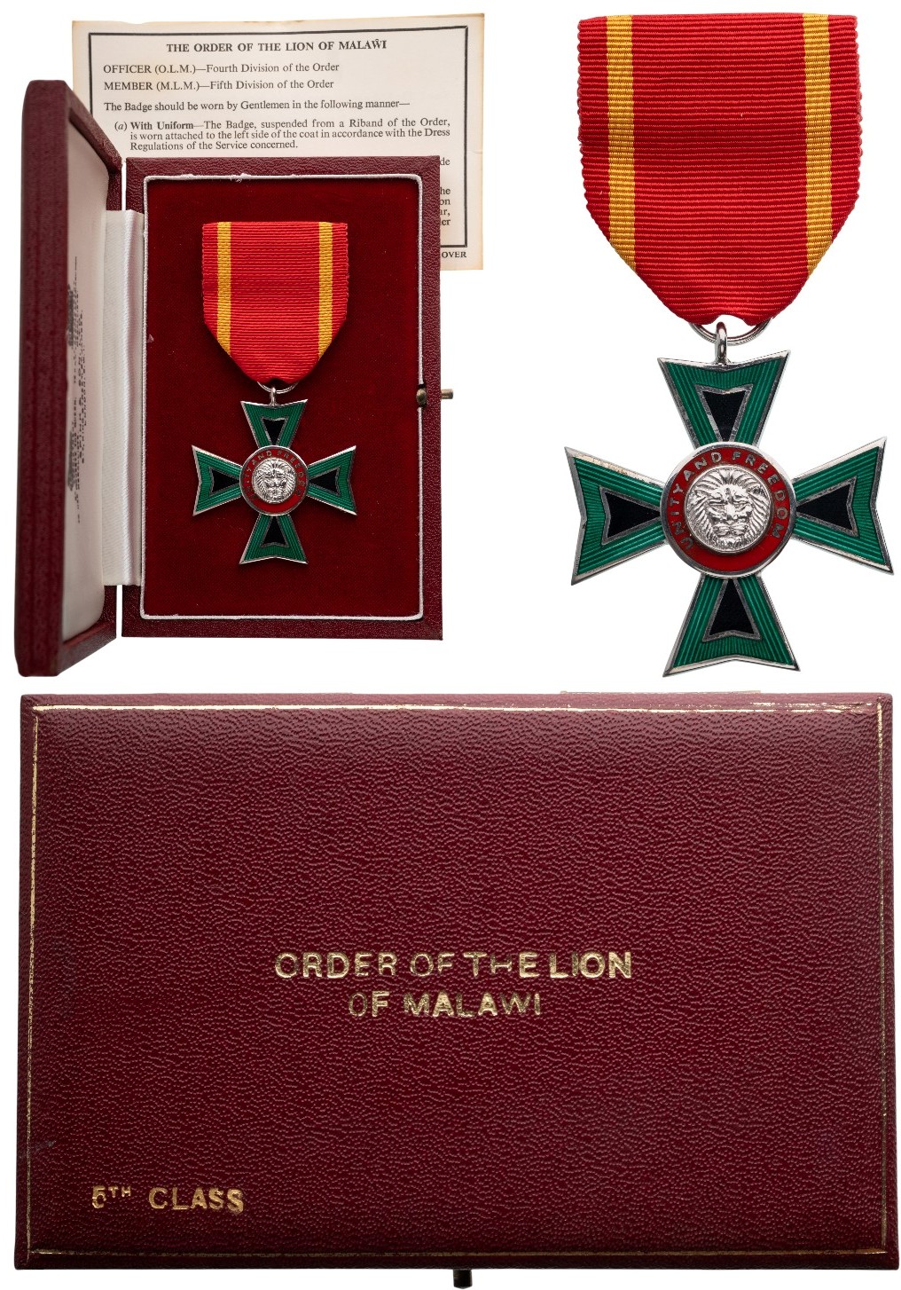 Knight's Cross, 5th Class, instituted in 1967. Breast Badge, 49x45 mm., Silver, one-side enameled, original suspension ring and ribbon with attachment bar, in case of issue by "Spink & Son - London" and gilt inscription on the lid, together with statutes of the order. A beautiful cross, awarded to an British Official, in mint condition! Scarce! I R!
