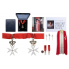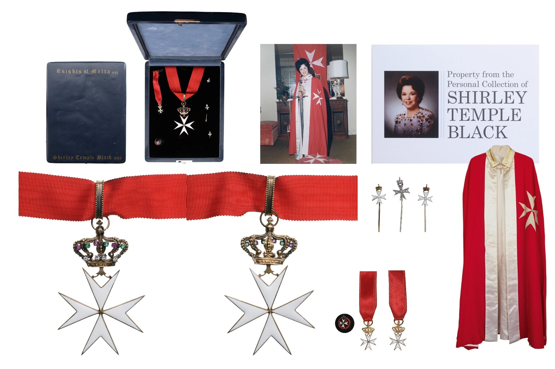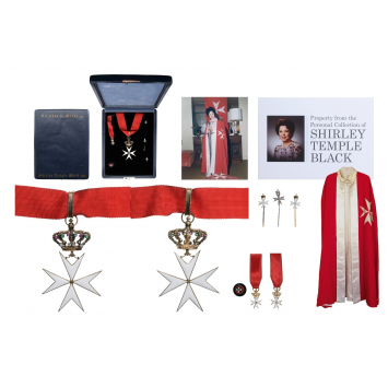 Complete, Jeweled group to a Dame of this semi-autonomous branch of the Malta Order, active in th USA, awarded and belonged to the famous actress Shirley Temple: Cross of the Order 78x49 mm., in gilt Silver and white enamel on both sides, upper crown of Royal type, set with brilliants, rubies and emeralds to the obverse face, grooved ribbon ring with beaded borders and original, red silk neck ribbon, in the original, deep-sea-blue morocco case of issue with fitted inner compartment, the lid with gold embossed "Knights of Malta" and "Shirley Temple Black" in Gothic script, together with an enameled miniature, 25x14 mm, in GOLD, with ribbon, two enameled lapel miniatures with long pin and a further miniature in silver, set with tiny diamonds, also fitted with long pin, TOGETHER, the robe as a red mantle with white order's cross, white silk collar and front borders, guarantee certificate of provenance and authenticity of the hereby offered pieces, being from the property of the actress.