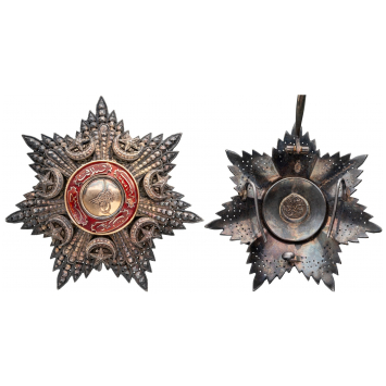 Grand Officer's Star, 2nd Class, Crimean Period. Breast Star, 85 mm., Silver, Turkish hallmarked, in chiseled and pierced silver with gold centre medallion also with the Sultan`s Tughra, with red enameled details and applied scrolls with inscriptions, the reverse with concave counter-medallion bearing the escutcheon of the Turkish Imperial Mint, broad pin and two hooks. A superb and very rare old star of the Crimea period, in extremely fine condition. I R!