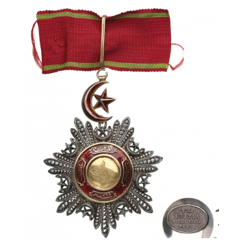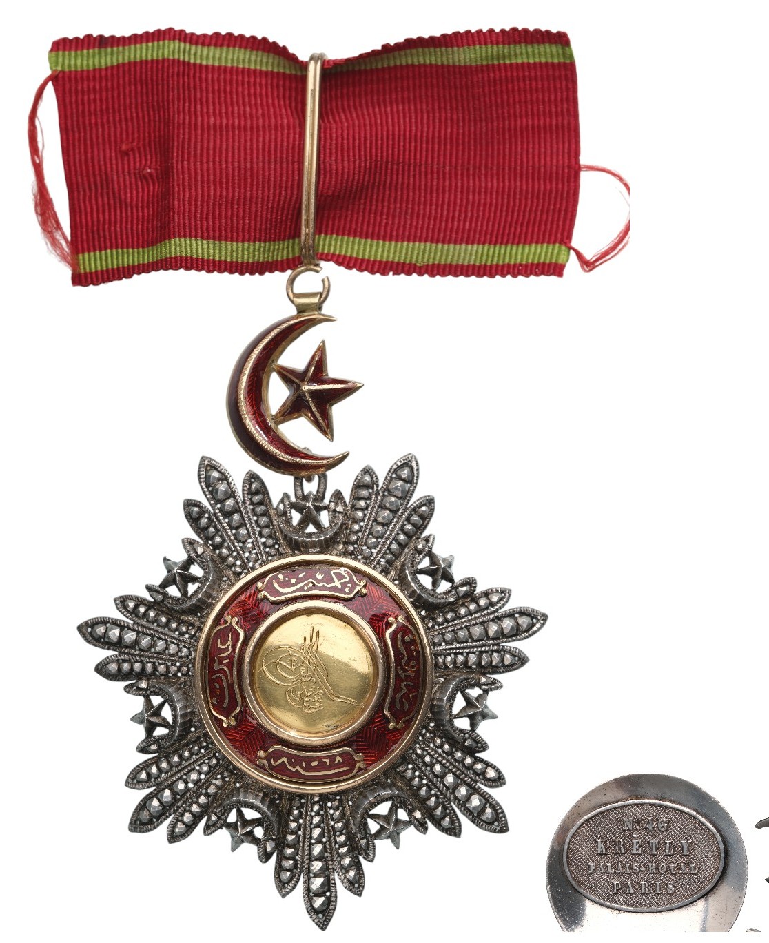 Commander's Cross, 3rd Class, instituted in 1862. Neck Badge, 84x62 mm, GOLD and Silver, maker's mark "Kretly - Paris", enameled, original Gold suspension crescent, ring and short ribbon. A superb badge, in extremely fine condition, of best French jeweller's quality! I