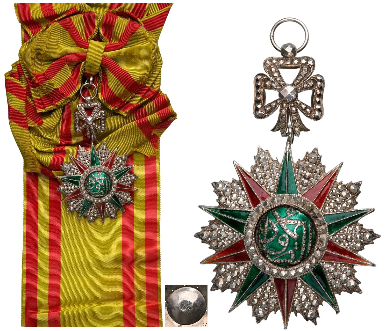 SKU: 1564 The Live Auction begins in: Click here to register for the live Auction Starting price 300 EUR Log in to place a bid. Total bids: 0TUNISIAGrand Cross Badge, 1st Class, Sidi Ahmed (1929 - 1942). Sash Badge, 94x61 mm, Silver, partially enameled, original suspension ring, loop and sash. Extremely fine condition. I . Shop ID: 69.86Auction LXX - Day 2