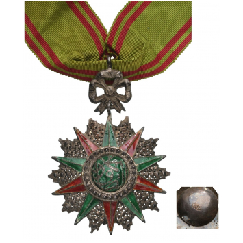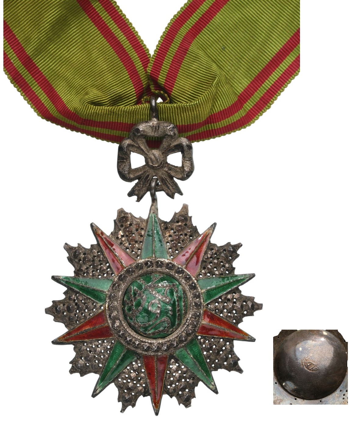 SKU: 1566 The Live Auction begins in: Click here to register for the live Auction Starting price 150 EUR Log in to place a bid. Total bids: 0TUNISIACommander’s Cross, 3rd Class, Mohamed es Sadok Bey (1859 - 1882). Neck Badge, 85x62 mm, Silver, one side enameled, original suspension ring and neck ribbon. Extremely fine quality! I Shop ID: 69.79Auction LXX - Day 2