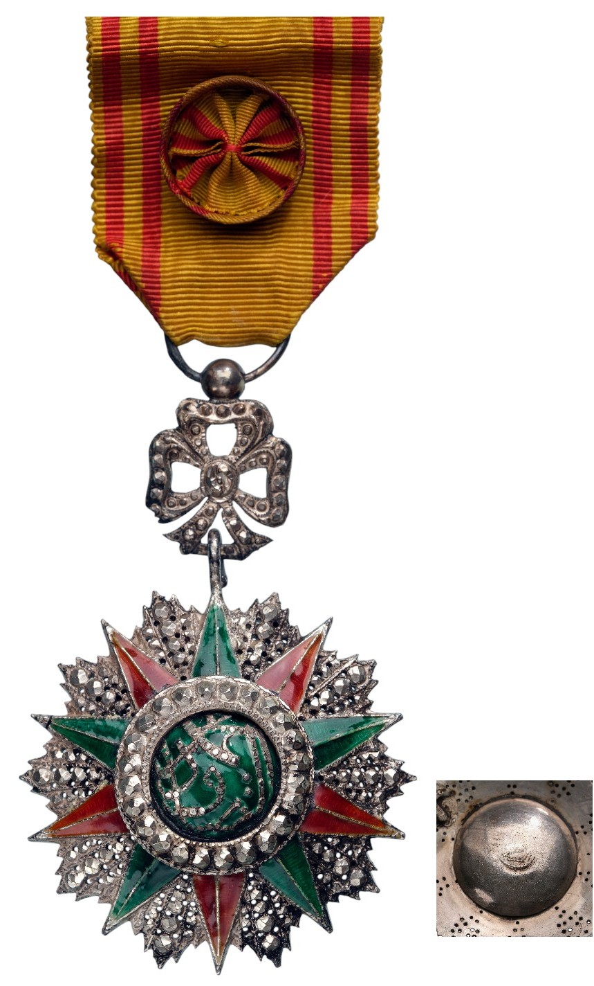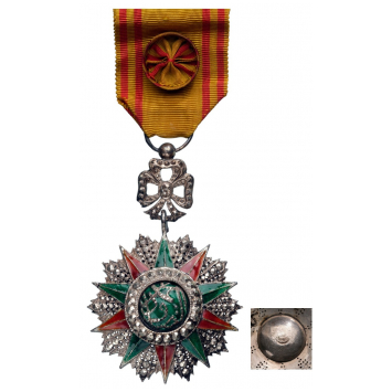 SKU: 1568 The Live Auction begins in: Click here to register for the live Auction Starting price 60 EUR Log in to place a bid. Total bids: 1TUNISIAOfficer’s Cross, 4th Class, Mohamed es Sadok Bey (1859 - 1882). Breast Badge, 78x49 mm, Silver, one side enameled, original suspension ring and ribbon with rosette. Extremely fine quality! I Shop ID: 69.81Auction LXX - Day 2