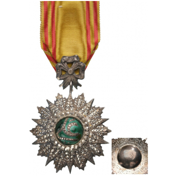 SKU: 1574 The Live Auction begins in: Click here to register for the live Auction Starting price 50 EUR Log in to place a bid. Total bids: 0TUNISIAKnight's Cross, 5th Class, Ali Bey (1882 - 1902). Breast Badge, 71x49 mm, Silver, partially enameled, original suspension ring and ribbon. Extremely fine condition. I . Shop ID: 69.59Auction LXX - Day 2