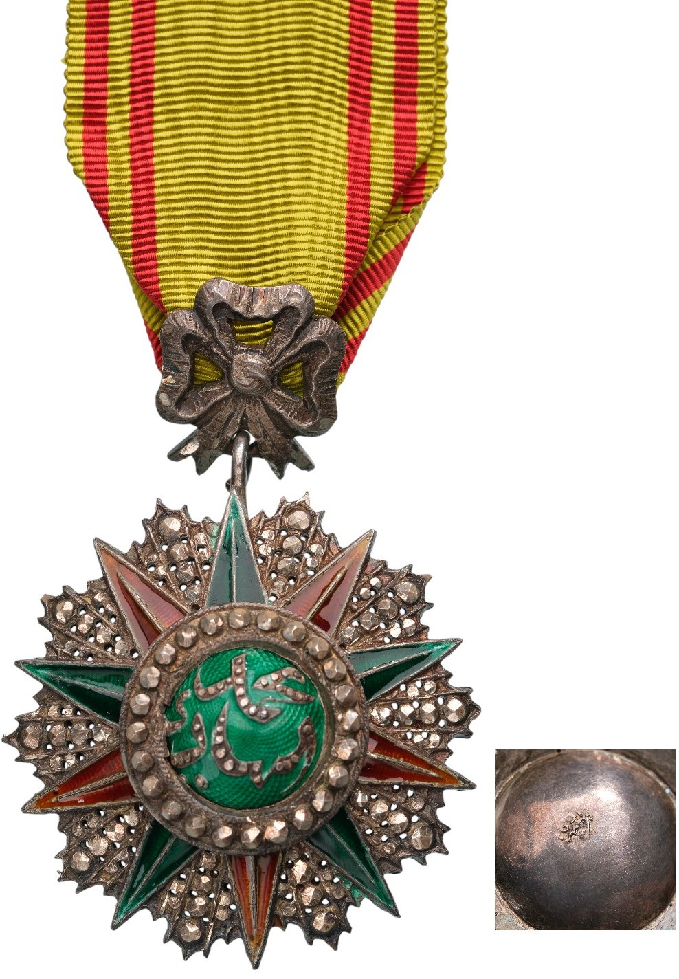 Officer’s Cross, 4th Class, Mohamed el Hadi (1902–1906). Breast Badge, 69x48 mm, Silver, 2 diamonds and 2 Emeralds on the suspension device, one side enameled, original suspension ring and ribbon. Extremely fine! I