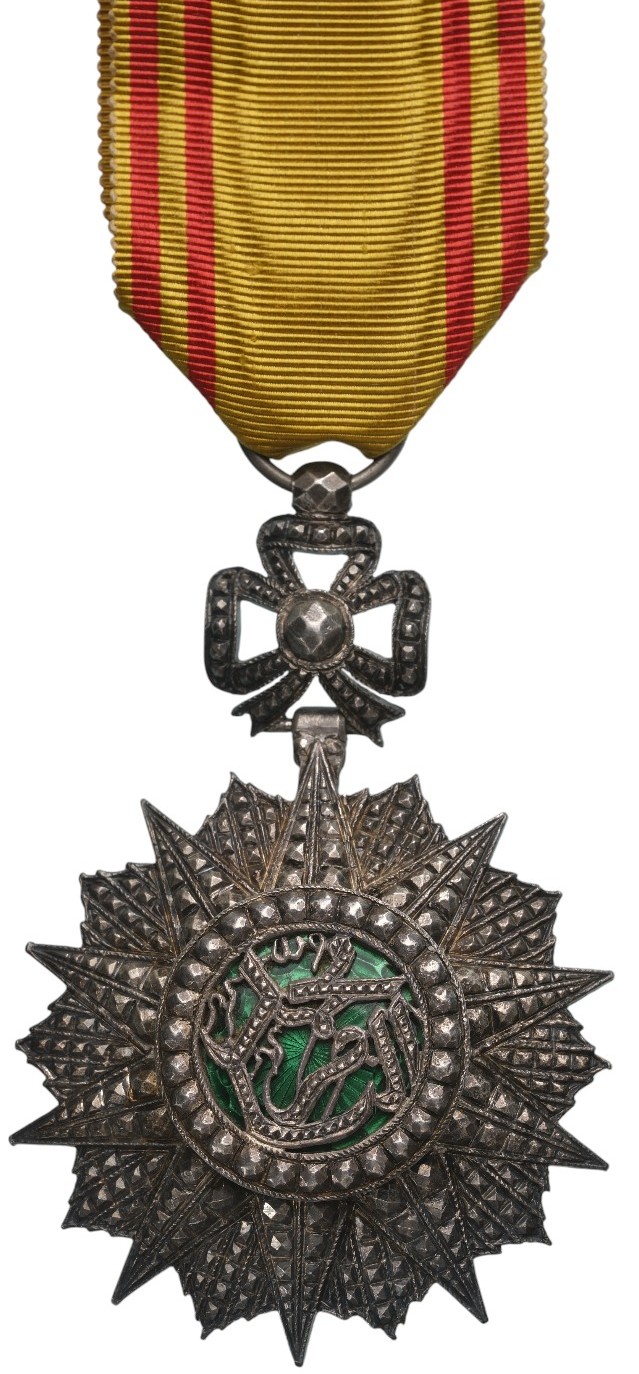 Knight’s Cross, 5th Class, Mohamed el Naceur (1905–1922). Knight’s Badge, 74x48 mm, Silver, partially enameled, original suspension ring and ribbon.