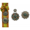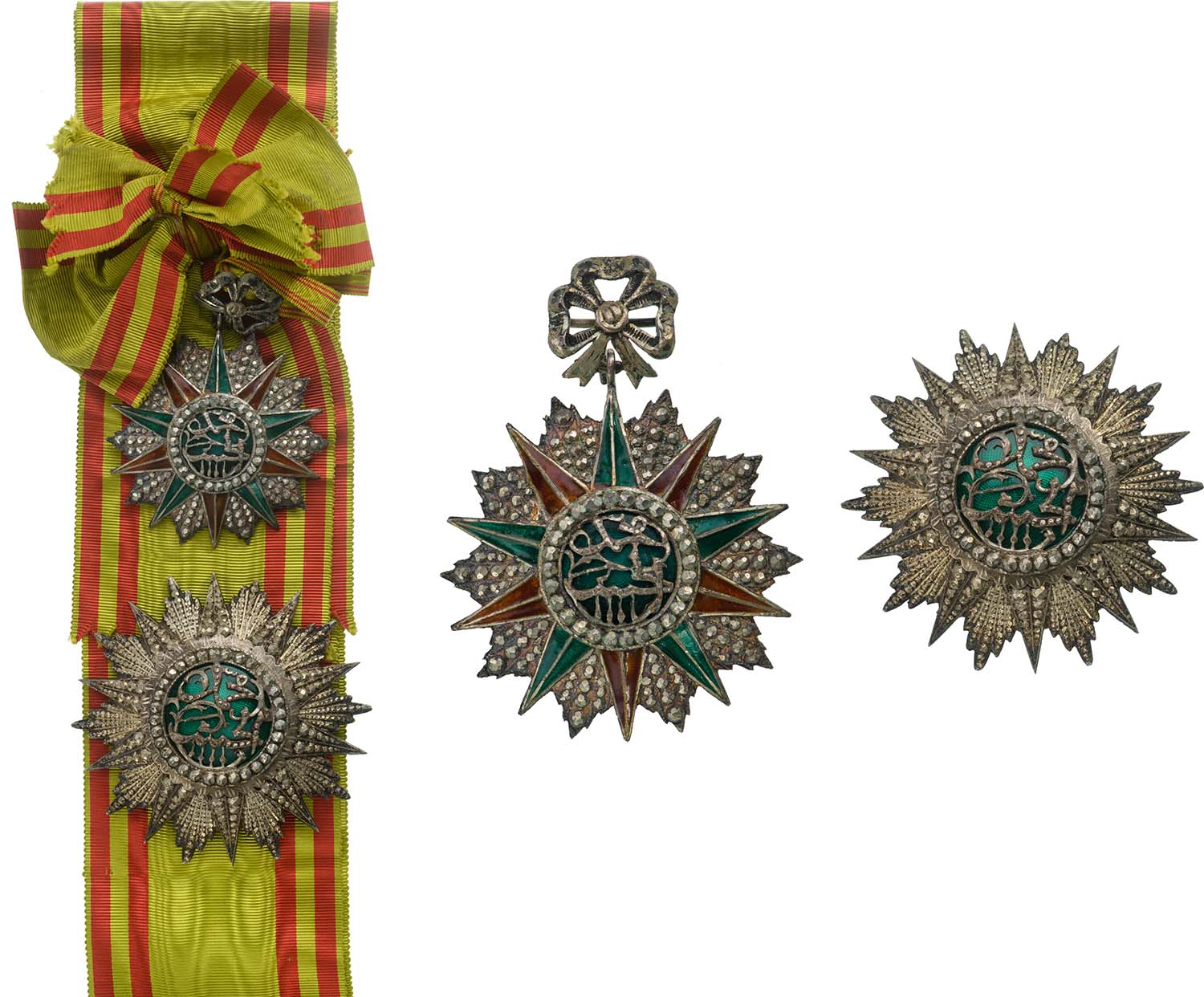 Grand Cross Set, 1st Class, Mohamed el Habib Bey (1922-1929). Sash Badge, 83x61 mm., Silver with brilliant cut rays, obverse enameled, original suspension device and long complete sash for Ladies. Breast Star, 82 mm, Silver, multipart construction, central medallion enameled, reverse with thin vertical pin. A nice in fine local manufacture, rare with ladies sash! I R!