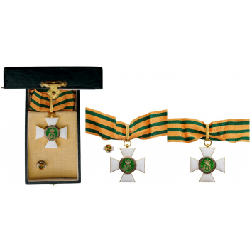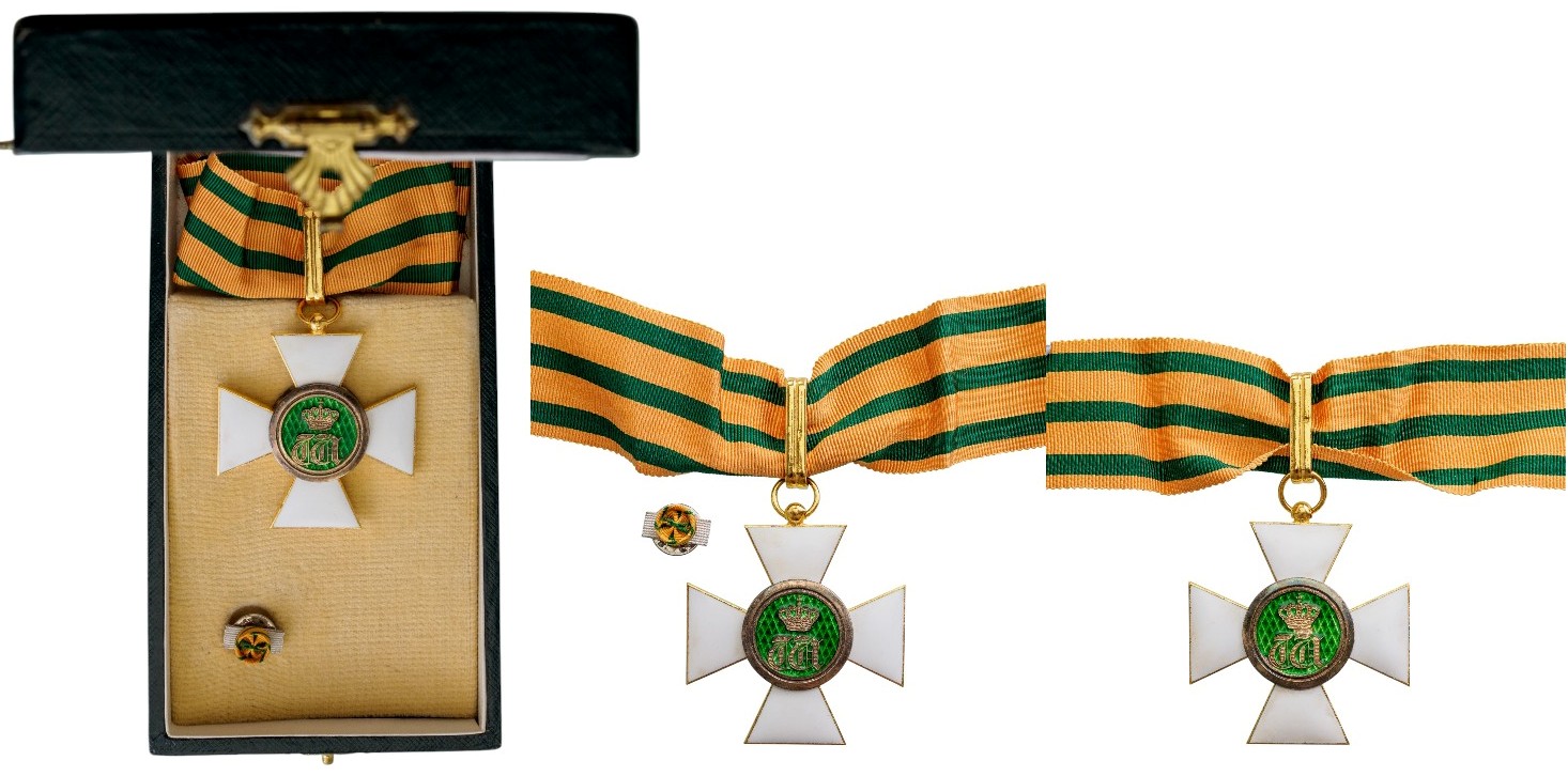 Commander's Cross, instituted in 1841. Neck Badge, 55x50 mm, gilt Bronze, both sides enameled, original suspension ring, loop and ribbon, in case of issue, together with lapel hole rosette. A splendid order, in mint condition! I