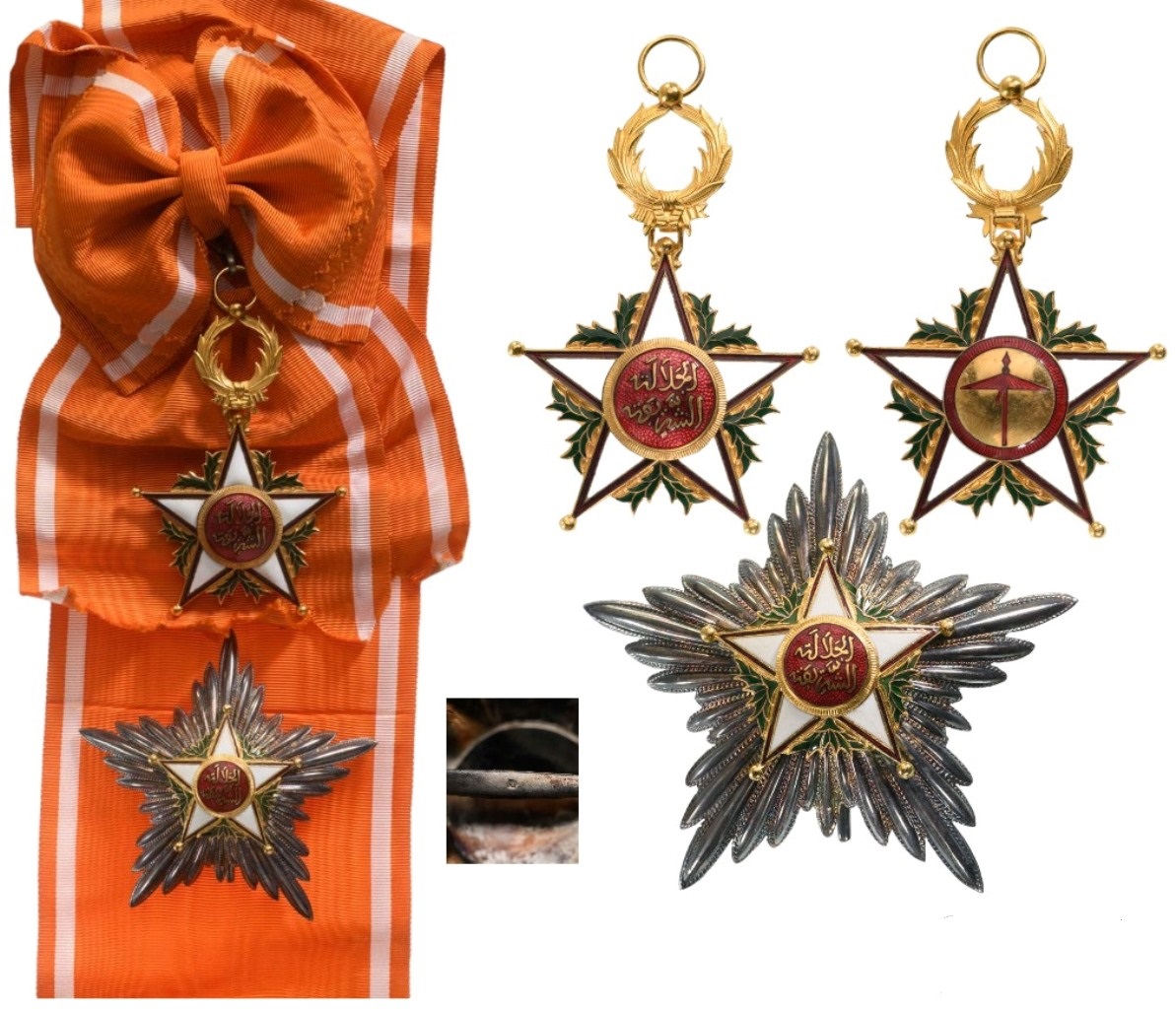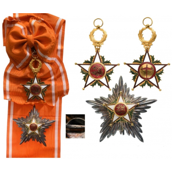 Grand Cross Set, 2nd Type, 1st Class, instituted in 1913. Sash Badge, 86x58 mm, gilt Bronze, both sides enameled, original suspension wreath, ring and long complete sash. Breast Star, 80 mm, partially gilt Silver, with smooth rays, superimposed part gilt, enameled, maker's mark "A. & B. - Arthus Bertrand", reverse with tapered vertical pin. Superb set, in mint condition! I