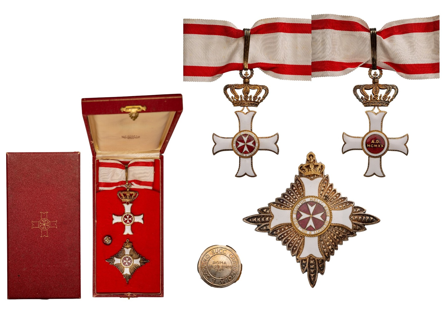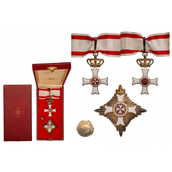 Grand Officer's Set, instituted in 1920. Neck Badge, 89x52 mm, gilt Silver, enameled, original suspension crown and ribbon, Breast Badge, 78 mm, Silver, central medalion enameled, gilt Silver, maker's mark "Gardino, Roma with vertical pin on the back. In case of issue by "Gardino,Roma with lapel hole rosette. I