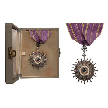Commander's Cross, instituted in 1961. Neck Badge, 72x58 mm, silvered metal, obverse partially enameled, central medalion gilt, enameled, original suspension loop and ribbon, in original case of issue by "Carrard". I