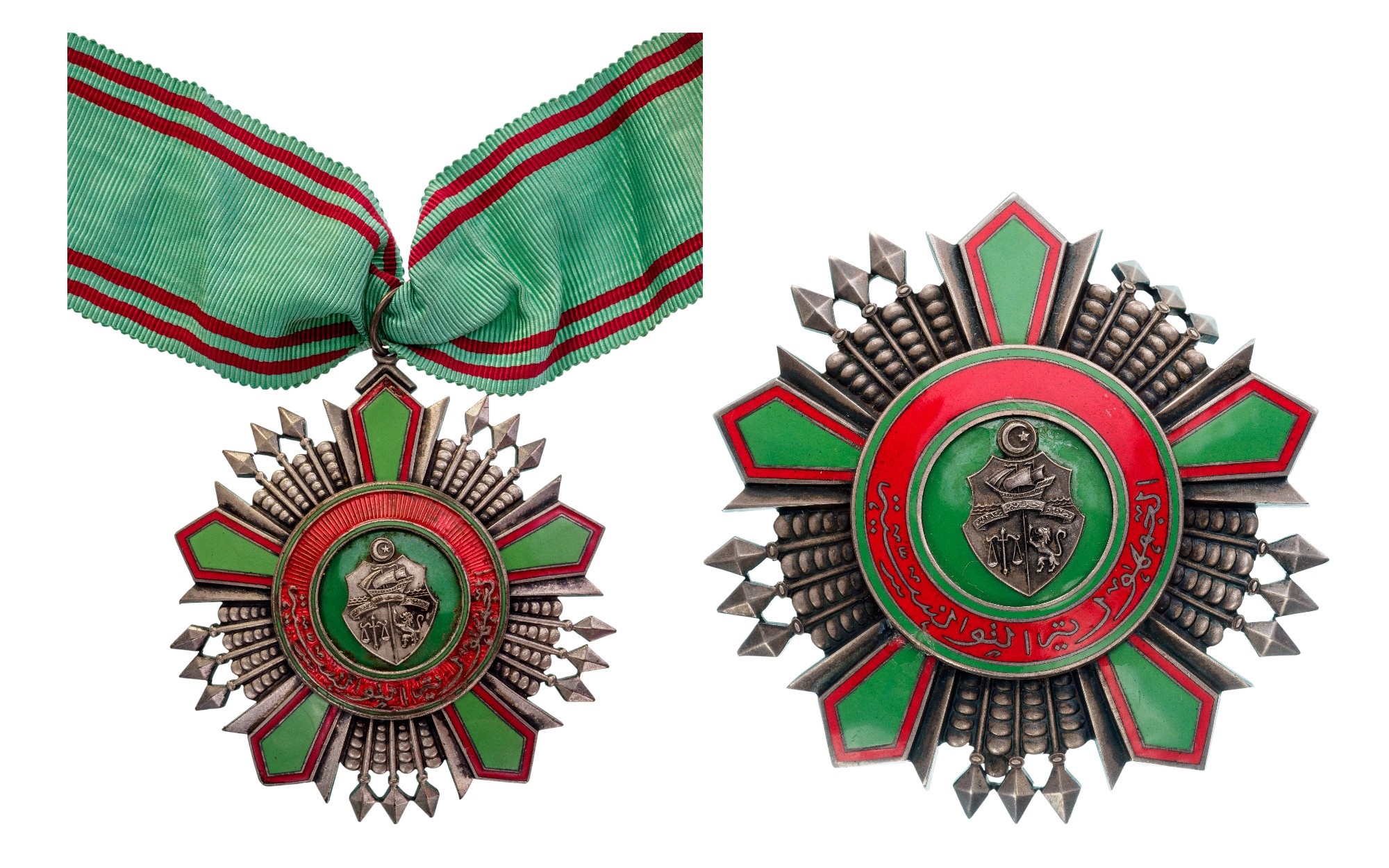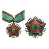 Grand Officer Set, 2nd Class, 2nd Type. Neck Badge 69x65 mm ., Silver, one-side enameled, Arabic inscription, smooth reverse, with original loop and ribbon. Breast Star, 81 mm., Silver, maker's mark, superimposed parts enameled, the reverse, fitted with broad, vertical pin and two dise hooks.