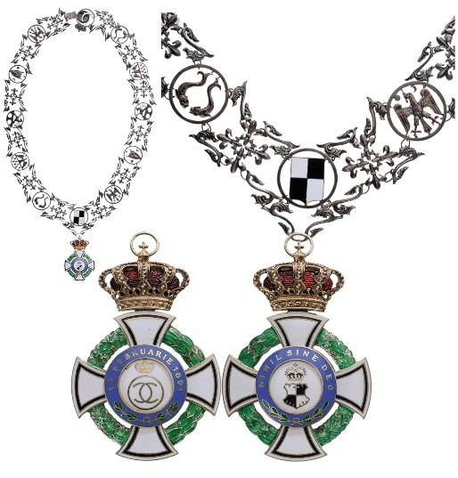 Collar Chain, of the 2nd Model. Collar Badge in gilt Silver, both sides enameled, blue enameled legend "NIHIL SINE DEO", surrounded by green enameled wreath, on reverse "10 februarie 1891", together with the collar chain consisting of silver and black enameled elements featuring the coat of arms of the Hohenzollern family and the weapons of the Romanian provinces, all plain on reverse. Beautiful old patina. Of the highest rarity, in best jeweler`s quality and extremely fine condition!Dim.: the badge, 75,0x50,0 mm; the chain approx., 850,0 mm.I RR!