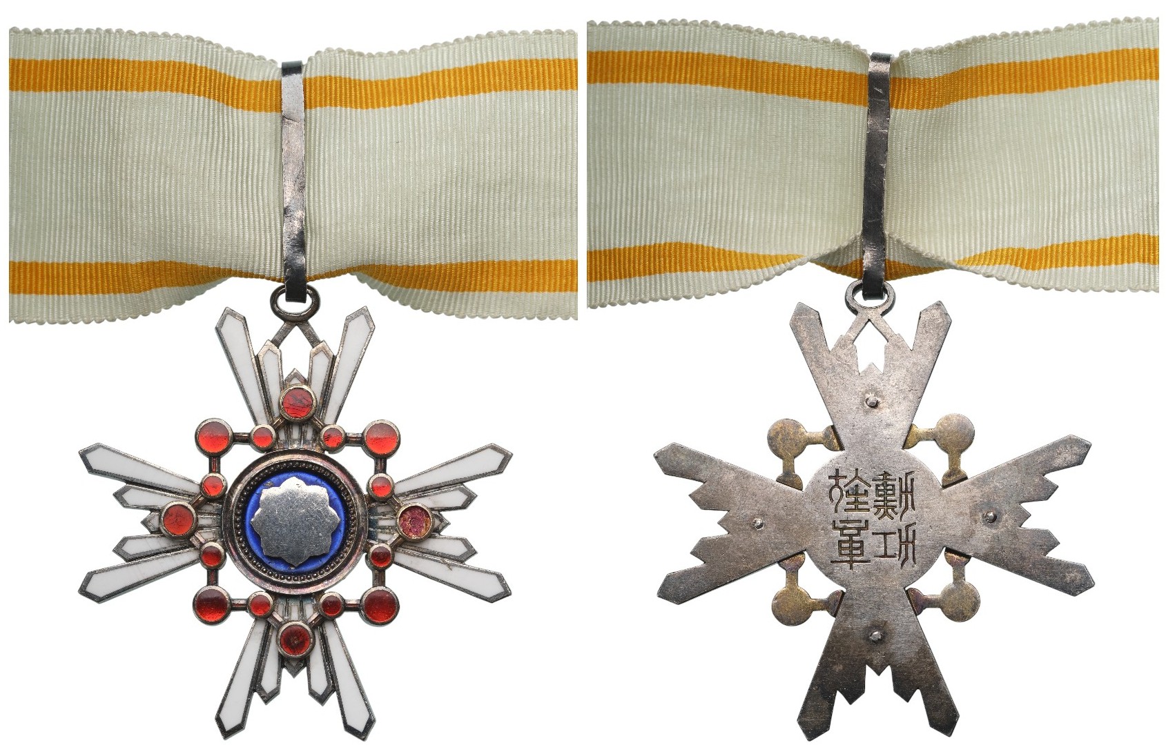SKU: 969 The Live Auction begins in: Click here to register for the live Auction Starting price 150 EUR Log in to place a bid. Total bids: 0JAPANCommander's Cross, instituted in 1888. Neck Badge, 54x52 mm, partially gilt Silver, one-side enameled (minor damage), suspension loop and original ribbon. Very fine condition! II Shop ID: 69,115Auction LXX - Day 2