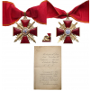 Commander`s Cross Military, 2nd Class, instituted in 1735. Neck Badge, 49x43 mm., GOLD, hallmarked "56, Kokoshnik, flower", maker's mark "AK - Anton Keibel", enameled, original suspension ring, loop and very large old ribbon, together with awarding document to a Lieutenant- Colonel, dated St. Petersburg, 13.10.1895. Superb set! I