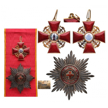 Grand Cross Set, instituted in 1735. Sash Badge, 58 x 52 mm., GOLD, four-armed cross with accurate chiselwork under the translucent red enamel, flanked by the typical ornaments, chiseled and pierced, obverse centre medallion with the miniature-enameled image of the saint standing within landscape, moulded outer circlet, the reverse with white enameled medallion, bearing growned monogram, struck with Russian maker's mark "BA, Edouard", under the enamel, round upper loop, this, struck with Russian gold marks "56, Kokoshnik", with original sash ribbon. Breast Star, 86 mm., Silver, maker's mark "Keibel", hallmarked "84, Kokoshink", with polished rays, centre medallion with red enameled cross, within beaded border, red enameled outer circlet with separately-made motto in silver “AMAN PIET JUSTET TID” silver Imperial crown sided by two angel-tenants, chiseled golden border, smooth reverse with long pin. A piece in the best Russian manufacture from the late 19th Century, in excellent condition. I