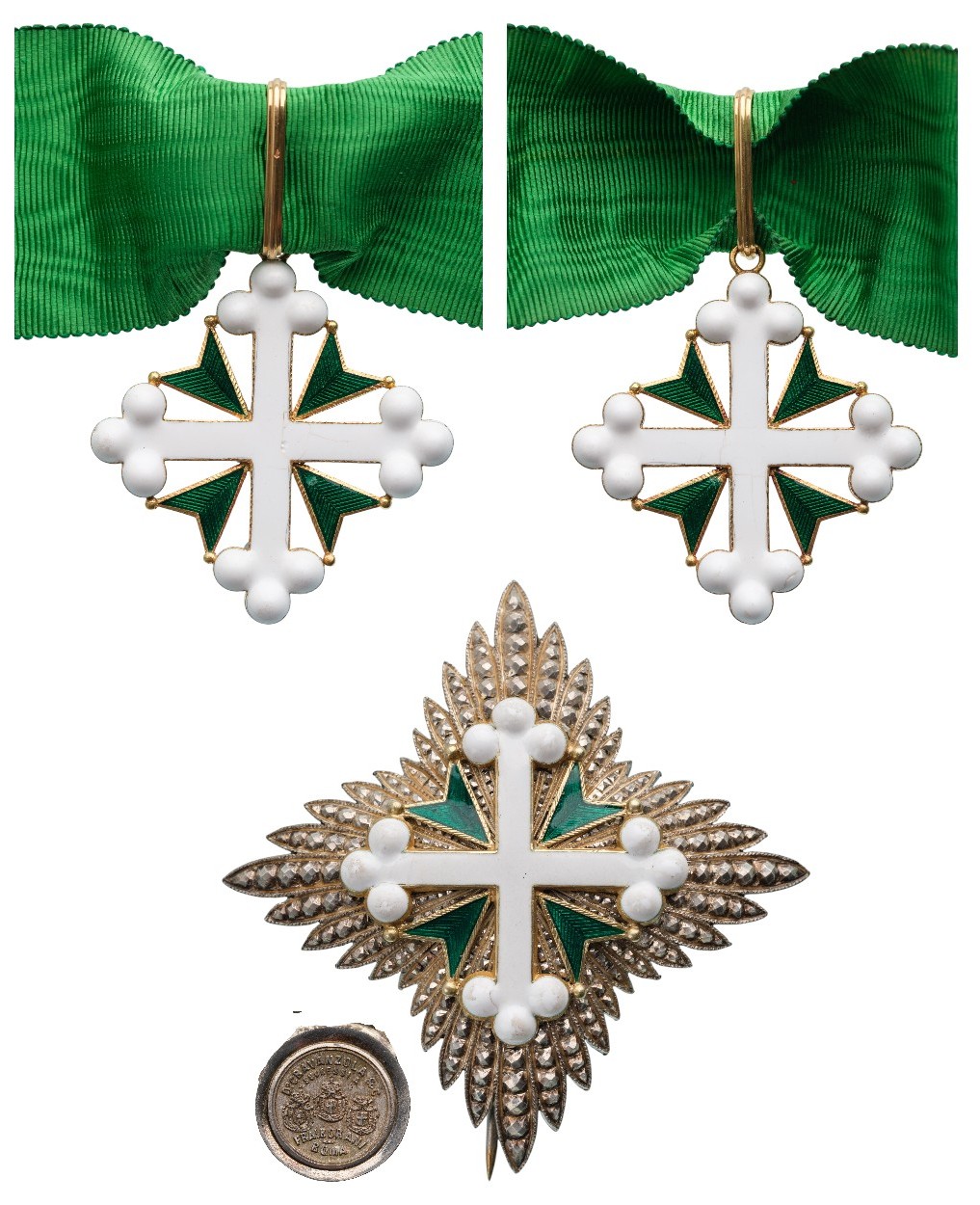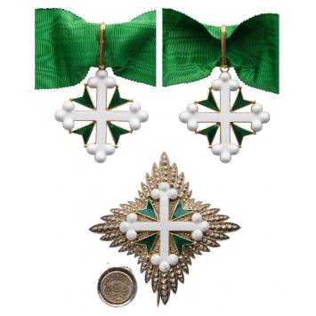 Grand Officer's Set, instituted in 1572. Neck Badge, 58x53 mm, GOLD, both sides enameled, original suspension ring and ribbon. Breast Star, 80 mm., gilt Silver and Silver, superimposed part enameled and gilt, thin pin on reverse, maker's mark "D. Cravanzola & C. - Roma". Superb set, in mint condition! I