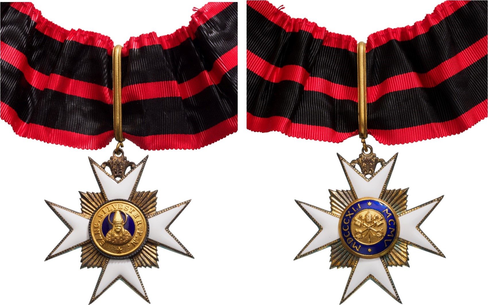 Commander's Cross, 3rd Class, instituted in 1841. Neck Badge, 62x56 mm, gilt Silver, with white enameled arms, blue enameled centre medallion with applied image of the saint within golden outer circlet with polished inscription and chiseled details, the reverse, with blue enameled medallion, with golden roman numeral "MDCCCXlI", within golden outer circlet with polished inscription on frosted ground, decorated upper loop, link ring and suspension ring, original, neck ribbon with ties, in case of issue "by "Tanfani&Bertarelli, Roma".