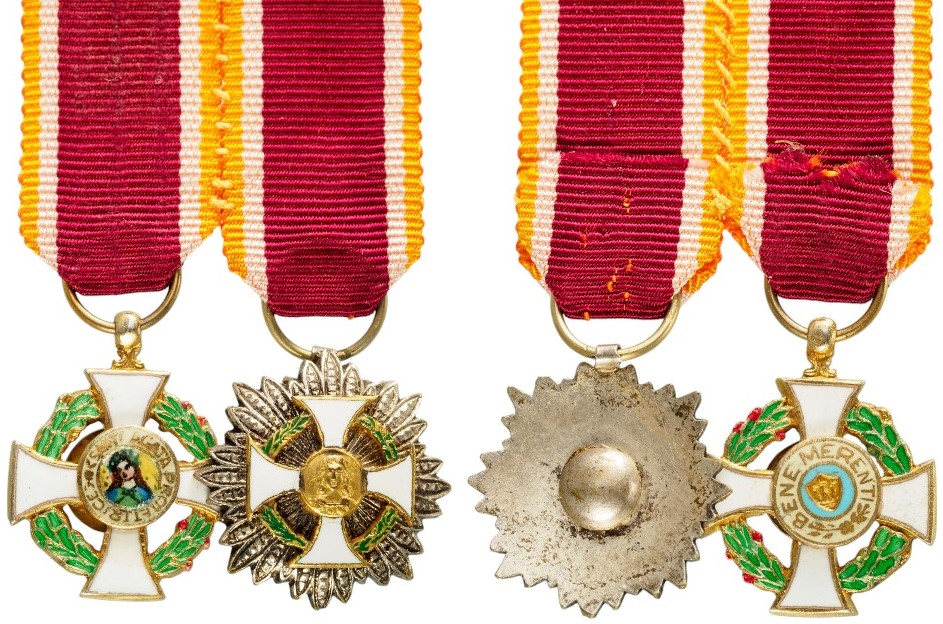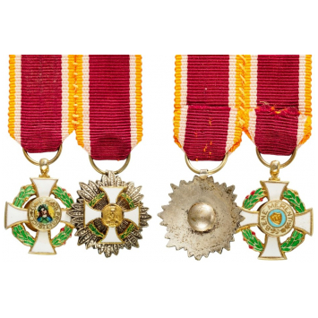 Grand Cross Set Miniatures. Breast Badge, 20x16 mm, gilt Silver, both sides enameled, original suspension ring and ribbon. Breast Star, 17 mm, Silver, superimposed part enameled, original suspension ring and ribbon. A beautiful rare set, in mint condition! I R!