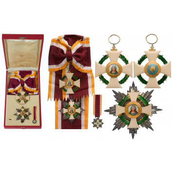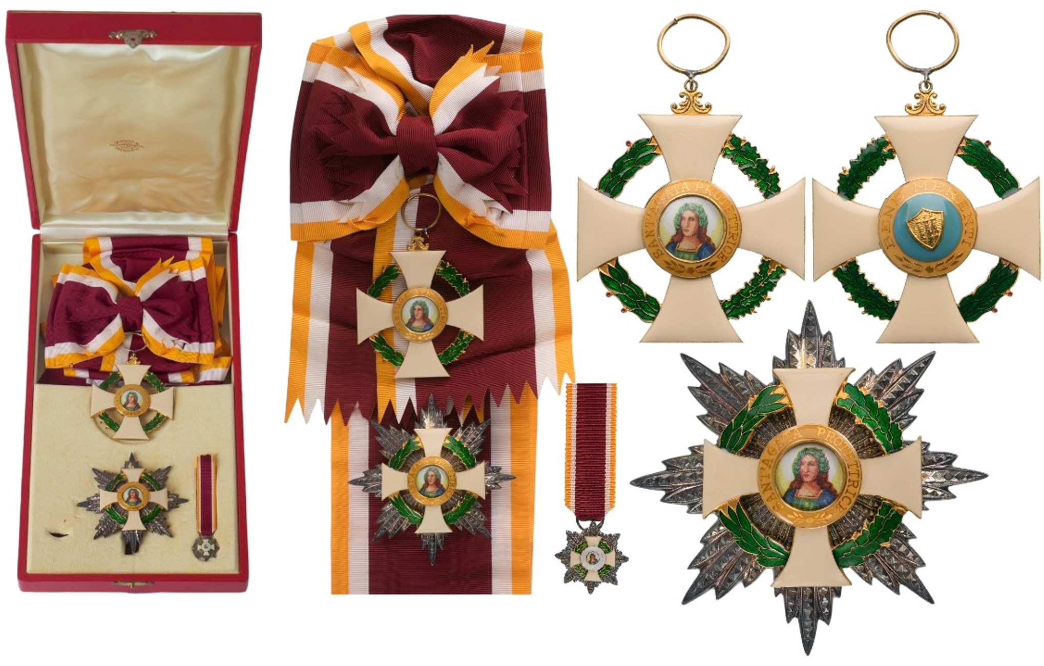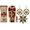 Grand Cross Set, instituted in 1923. Sash Badge, 74x64 mm, gilt Silver, enameled, original loop and sash. Breast Star, 84 mm, Silver and gilt Silver, maker's mark "S. Johnson - Milano-Roma", diamond cut rays, superimposed parts gilt, enameled, thin pin on reverse, together with enameled miniature, in original case of issue by "S. Johnson - Milano". Beautiful complete set! I