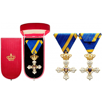 Knight's Cross, instituted in 1849. Breast Badge, 19x15 mm, GOLD, Austrian hallmarked, white enameled lilied cross, centre shield with polichrome enameled image of the saint in armour on red background, within deep-blue enameled border, bearing the Order’s motto “DEUS ET DIES” in gold lettering, reverse centre shield with Bourbones’ three golden fleurs-de-lys on translucent, deep-blue enamel, hinged suspension crown and original suspension ring and ribbon, in case of issue with git crown on the lid. Rare and superb! II R!