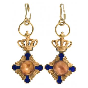 SKU: 1166 The Live Auction begins in: Click here to register for the live Auction Starting price 130 EUR Log in to place a bid. Total bids: 0ROMANIAOfficer's Cross Miniature, 1st Model (1877), for Civil. Breast Badge, 19x12 mm, GOLD, 1.5 g., superimposed part gilt and enameled, centers missing, original suspension ring. IV RR! Shop ID: 121656Auction LXX - Day 2