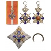 1st Class Set for Military (1938). Sash Badge with swords, 86x57 mm, Silver, both sides dark blue enameled obverse medallion with cipher of Carol I, reverse medallion with 1877, original crown and suspension ring, hallmarked "SILBER, 354 Mn 42, crown", maker`s mark "CFZ", original sash. Breast Star with swords, 90 mm, Silver, superimposed parts gilt and enameled, brilliant cut, multipart construction, reverse with medium pin back, hallmarked "SILBER, 545 Mn 41, crown", maker`s mark "CFZ". Extremely rare set and model awarded to only 25 recipients in 1938! I RR!
