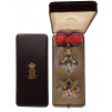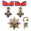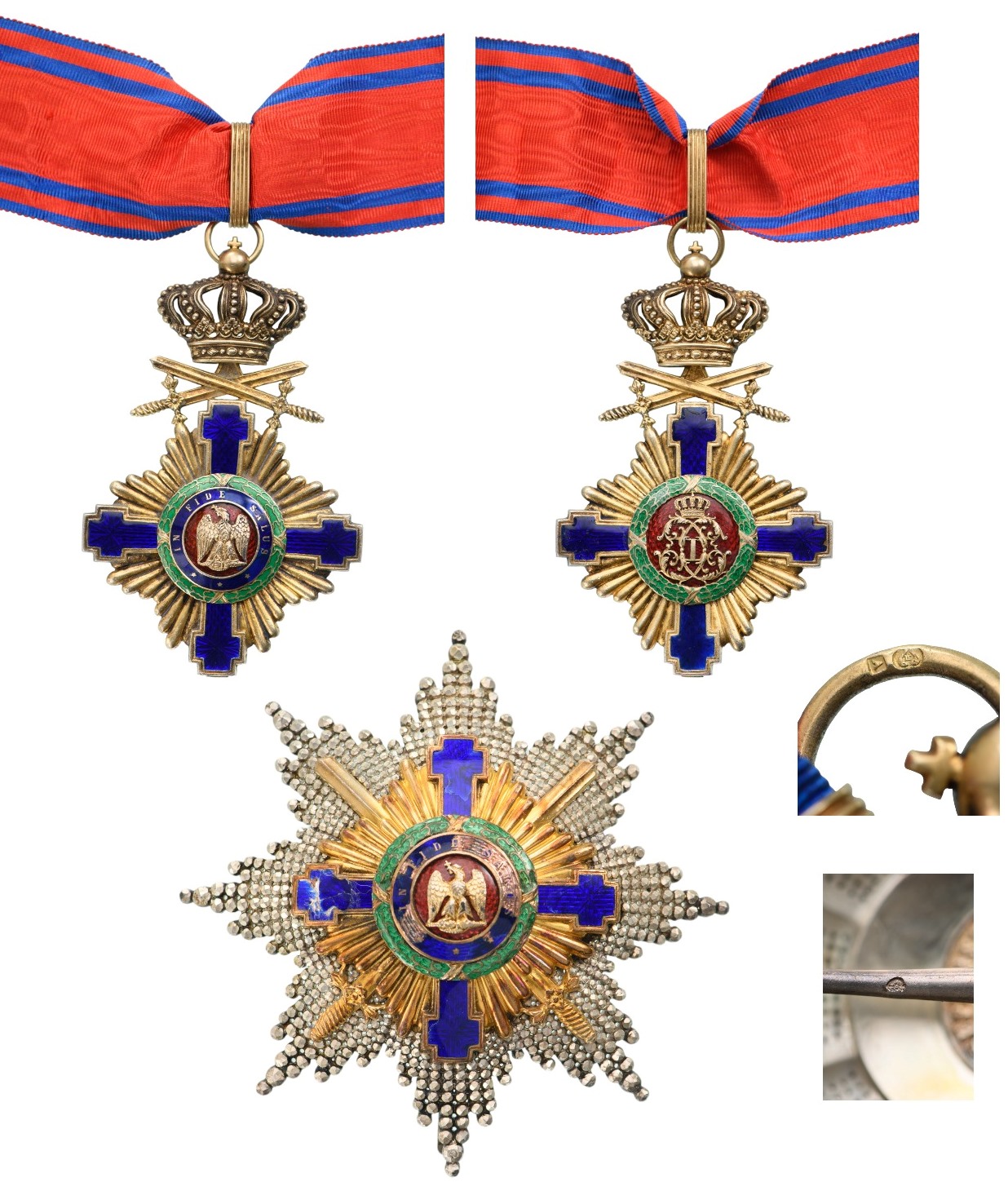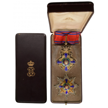 Grand Officer Set, 1st Model (1877-1932) for Military in Time of Peace. Neck Badge, 103x66 mm, gilt Silver, hallmarked "V, 2 dolphins", enameled, original suspension loop and ribbon. Breast Star, 90 mm, Silver, hallmarked "2 dolphins", maker's mark "Joseph Resch Fils, Bucharest", partially gilt and enameled, brilliant cut, reverse medium pin, in case of issue by "Joseph Resch Fils, Bucharest", with gilt monogram of King Carol I on the lid. A superb and very rare set in perfect condition. I RR!
