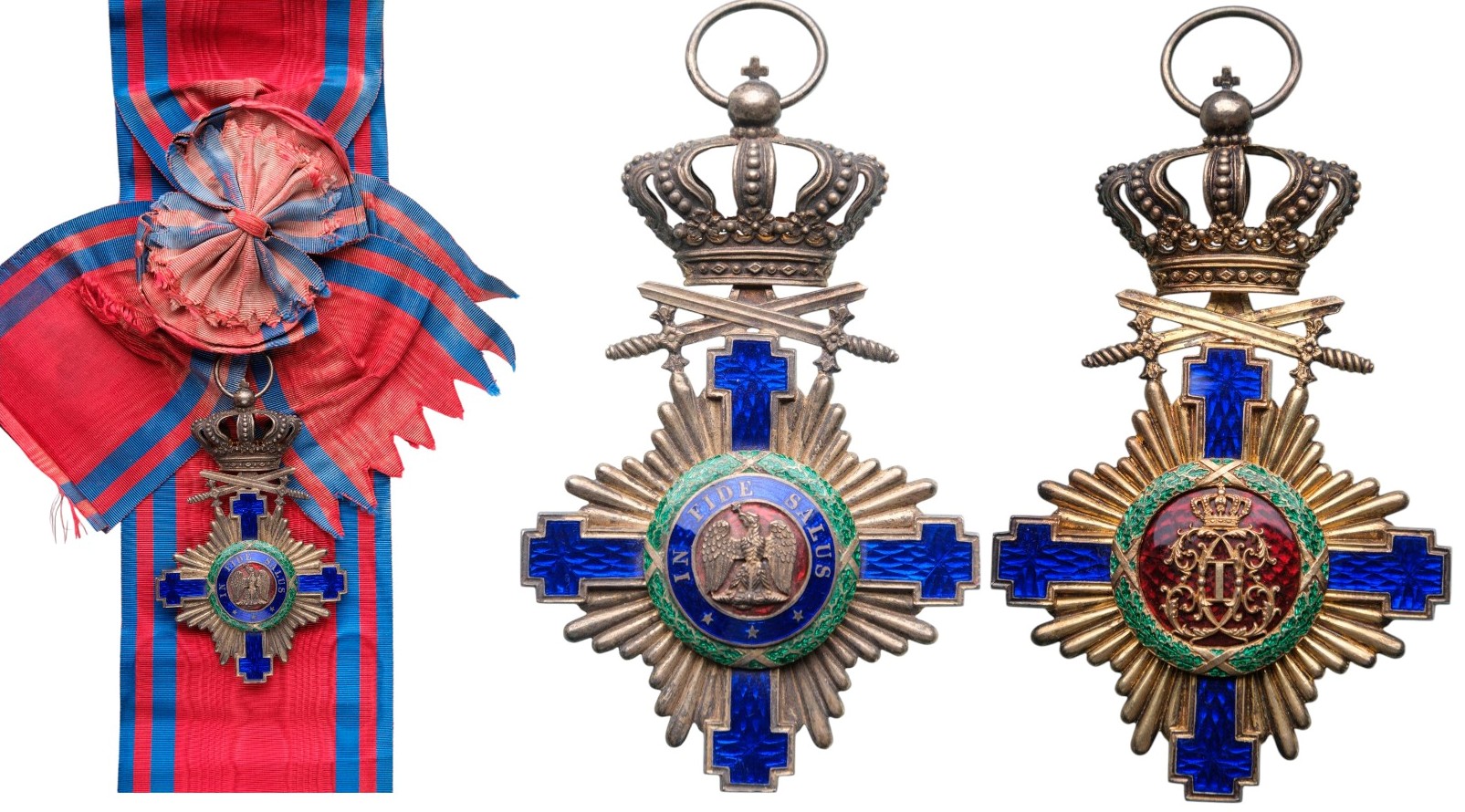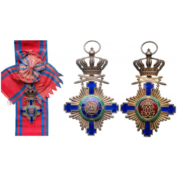 Grand Cross Badge, 1st Model (1877), for Military in Time of Peace. Sash Badge, 114x72 mm, gilt Silver, both sides enameled, original suspension ring and long complete sash. Very rare badge, in superb condition! RR! I