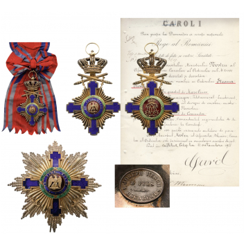 Grand Cross Set (1885), 1st Model, for Military in Time of Peace (swords under the crown). The order, instituted formally on 10th of May, 1877, was extended to the division "military in time of peace" in 1885, taking the form with swords under the crown, and for "military in war", with swords to the centre of the cross. Sash Badge in gilt Silver, maker`s mark "Resch", both sides dark blue enameled, obverse medallion with the eagle, reverse medallion with Carol I cipher. Original short sash in very good condition. Breast Star with swords, Silver, maker`s mark "Josef Resch&Fils, Bucarest", partially gilt and enameled, brilliant cut. Interesting set, very rare! Together with extremely rare awarding document dated 11th of October 1911,