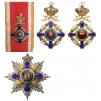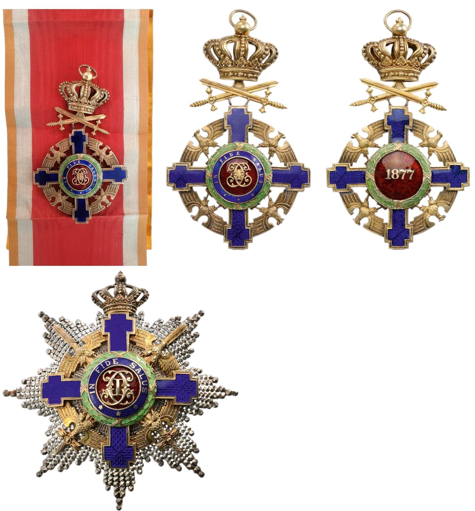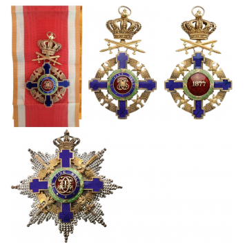 Grand Cross Set, 2nd Model (1938), for Military in Time of Peace. Sash Badge, 108x65 mm, gilt Silver, maker's mark "Resch", both sides dark blue enameled, obverse medallion with Carol I cipher, reverse medallion with "1877", with original crown, suspension loop and original unsewn sash. Breast Star with Swords, 75 mm, Silver, hallmarked "341-42, SILBER, crown", maker`s mark "CFZ". superimposed parts gilt and enameled, brilliant cut, multipart construction, reverse with medium pin back. Extremely rare set, only 15 pieces awarded!
