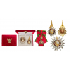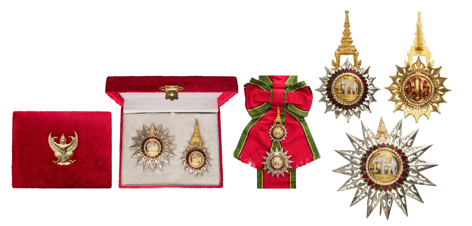Grand Cross Set of the Order. Sash Badge 93x54 mm., gilt Silver, hallmarked, original suspension in the form of the Thai crown, with original long sash. Breast Star, 78 mm, gilt Silver, hallmarked, with chiseled and pierced arms, the reverse, fitted with gilt vertical pin, in the original, case of issue, the lid with gilt Thai divinity and fitted, inner compartment. A beautifully-made set, in excellent condition.I