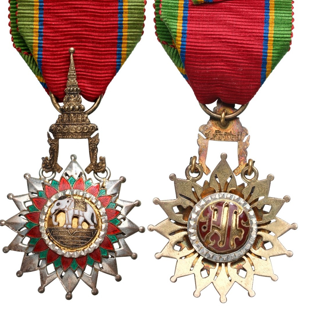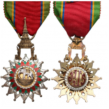 SKU: 1552 The Live Auction begins in: Click here to register for the live Auction Starting price 40 EUR Log in to place a bid. Total bids: 0THAILANDKnight's Cross, instituted in 1869. Breast Badge, 60x34 mm, gilt Silver, hallmarked, enameled, suspension in the form of the Thai crown, with original, ribbon. Mint condition! I Shop ID: 69,100Auction LXX - Day 2