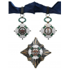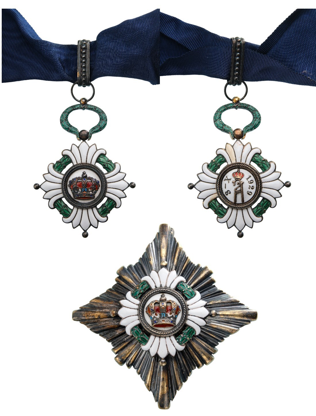 Grand Officer’s Set, 2nd Class, instituted in 1930. Neck Badge, 75x55 mm, gilt Silver, both-sides enameled (minor restoration on one ray), central medallion gilt silver, original suspension wreath, ring, loop and ribbon. Breast Star, 75 mm, Silver, superimposed part gilt silver, enameled, reverse with long vertical pin and two side hooks.