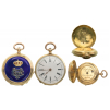 Gold, 35 mm., with inner maker’s mark of Constantin, Geneva, white enameled face with Roman hours and Arab minutes, golden arrows, blue enameled reverse bearing the separately-made, blue enameled, golden bordered cypher “VE”, with golden Royal crown above, its inner details, in red enamel, round, hinged suspension.