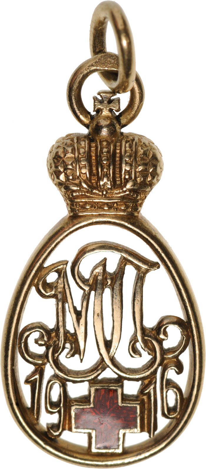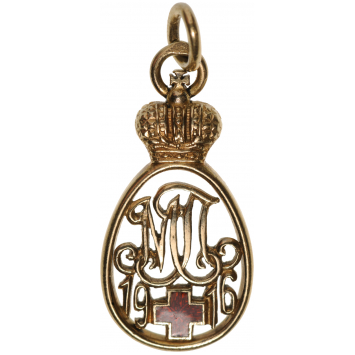 Breast Badge, 27x13 mm, GOLD, of oval form, bearing an ornated, cyrillic monogram “MP” (or “ML”) and below red enameled Geneva Cross flanked by the year’s numeral “1916”, the whole surmounted by the Tsar’s crown, upper loop struck with “AK” and cyrillic mark “F” for the workshop of Carl Faberge and small, round, suspension ring, smooth, polished reverse. A beautifully-made badge from the last period of the Russian Empire, thus extremely rare, excellent condition. I RR!