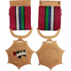 Breast Badge, 54x47 mm, gilt Bronze, one-side enameled, original ornamented suspension bar and ribbon. The Rescue Medal is given to members of the Police and Security force who have distinguished themselves in firefighting, ambulance, and rescue services as well as volunteers and community members who have at grave personal risk saved the lives or property of others. The star-shaped award has seven stylised rays with a central design depicting a helicopter, police carrying a stretcher, and a boat to represent the Ministry's air services, land services, and maritime services. An enamel depiction of the U.A.E. flag provides the backdrop to the gilt silhouettes and the suspension bar is made up of a half-wreath of laurel leaves. I Scarce! R!