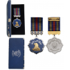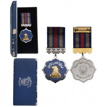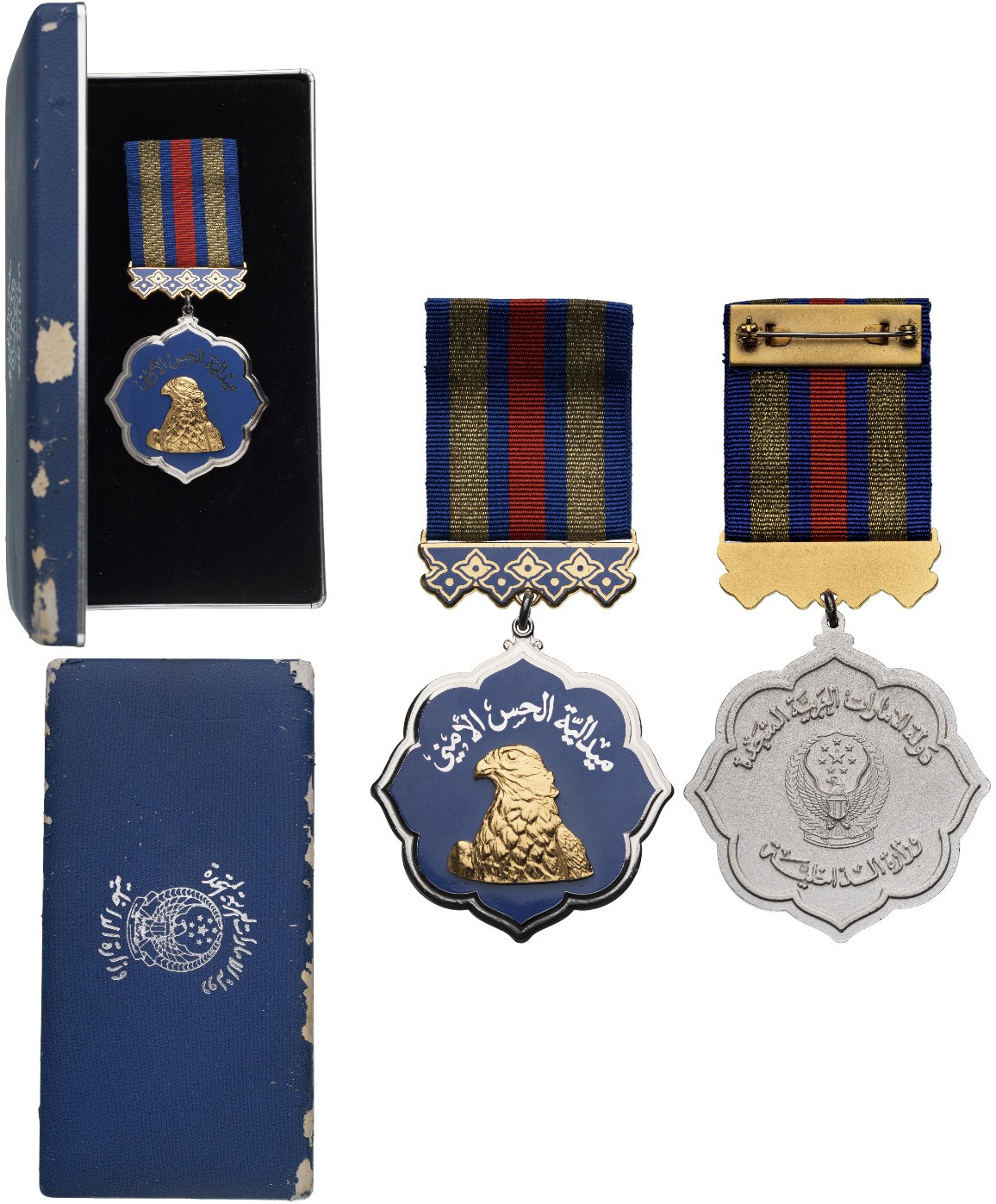 Breast Badge, 69x51 mm, gilt and silvered Bronze, one-side enameled, original suspension ring and ribbon. A very rare medal, in case of issue with gilt weapon on the lid and cardboard protection box with gilt weapon on the lid, by "Fattorini - Birmingham"! The Security Awareness Medal is awarded to members of the Police and Security force as well as community members who contribute to the discovery or prevention of a serious crime or security lapse. The award's design directly correlates with its purpose, featuring a gilt falcon against a blue enamel background. The falcon is known for its keen scouting senses and hunting ability, in addition to representing the Bedouin. I RR!