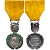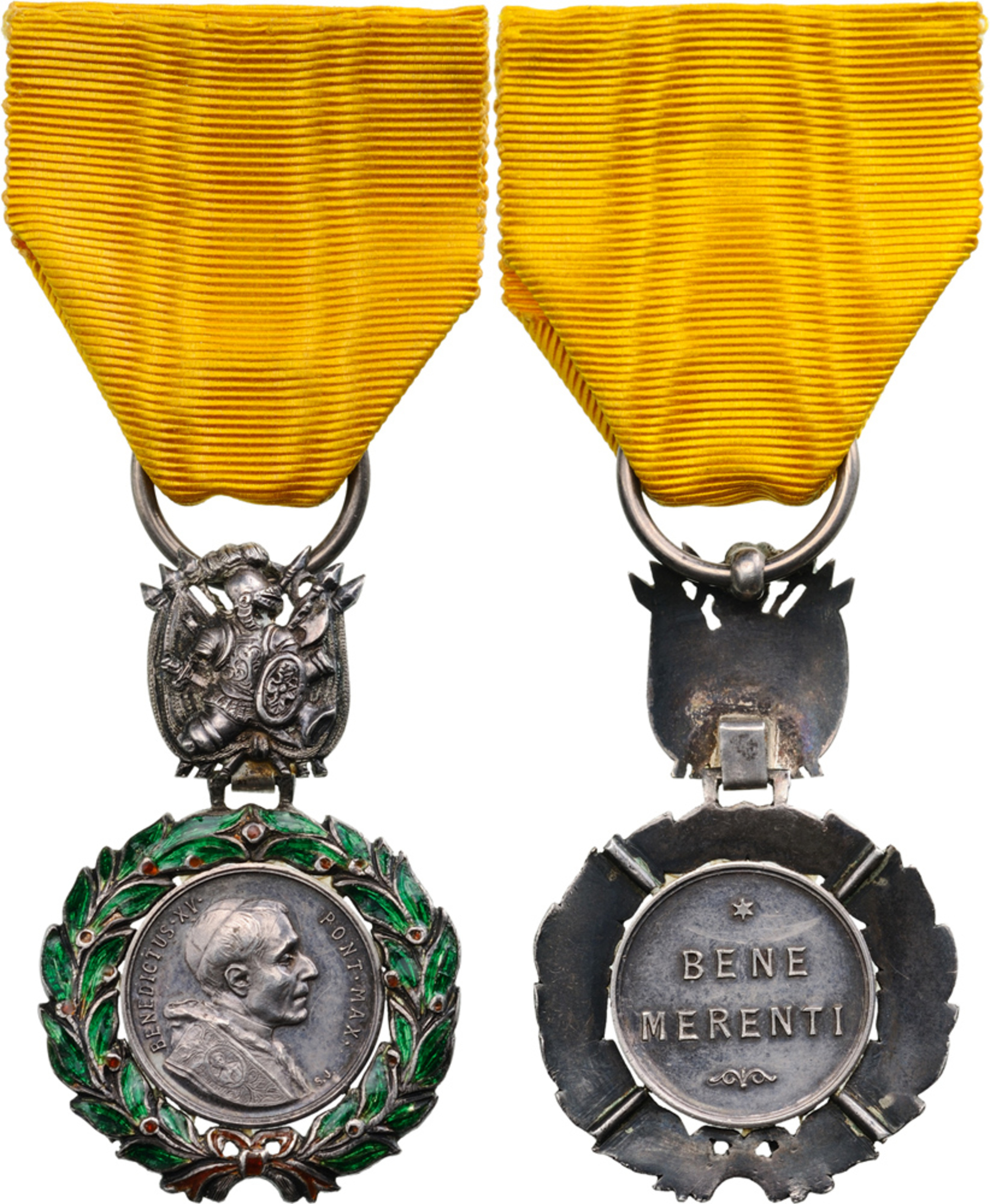 Round Medallion with the bust of Pope Benedict XV (1915-1922) facing right, 50x32 mm, surrounded by the inscription "BENEDICTUS XV PONT. MAX." and below, right, the maker`s signature "S.J." (Stefano Johnson, Milan), within a separately-made laurel wreath with green enameled leaves and orange-red enameled berries and the bow tying the branches, the reverse with round medallion, bearing the motto "BENE MERENTI", and the well-visible, 4 thin tubes with inserted pins, mounting the medallion to the wreath, rectangular upper loop and finely chiseled Trophy suspension, large, round ring and original ribbon. An extremely rare decoration, superb condition. The Medal for Military Merit was the highest honour besides the Orders, given to Officers of the armed corps in defence of the Holy See, first instituted by Pope Gregorius XVI after the Napoleonic wars, then renewed by each subsequent Pope, until Paul VI. I RR!