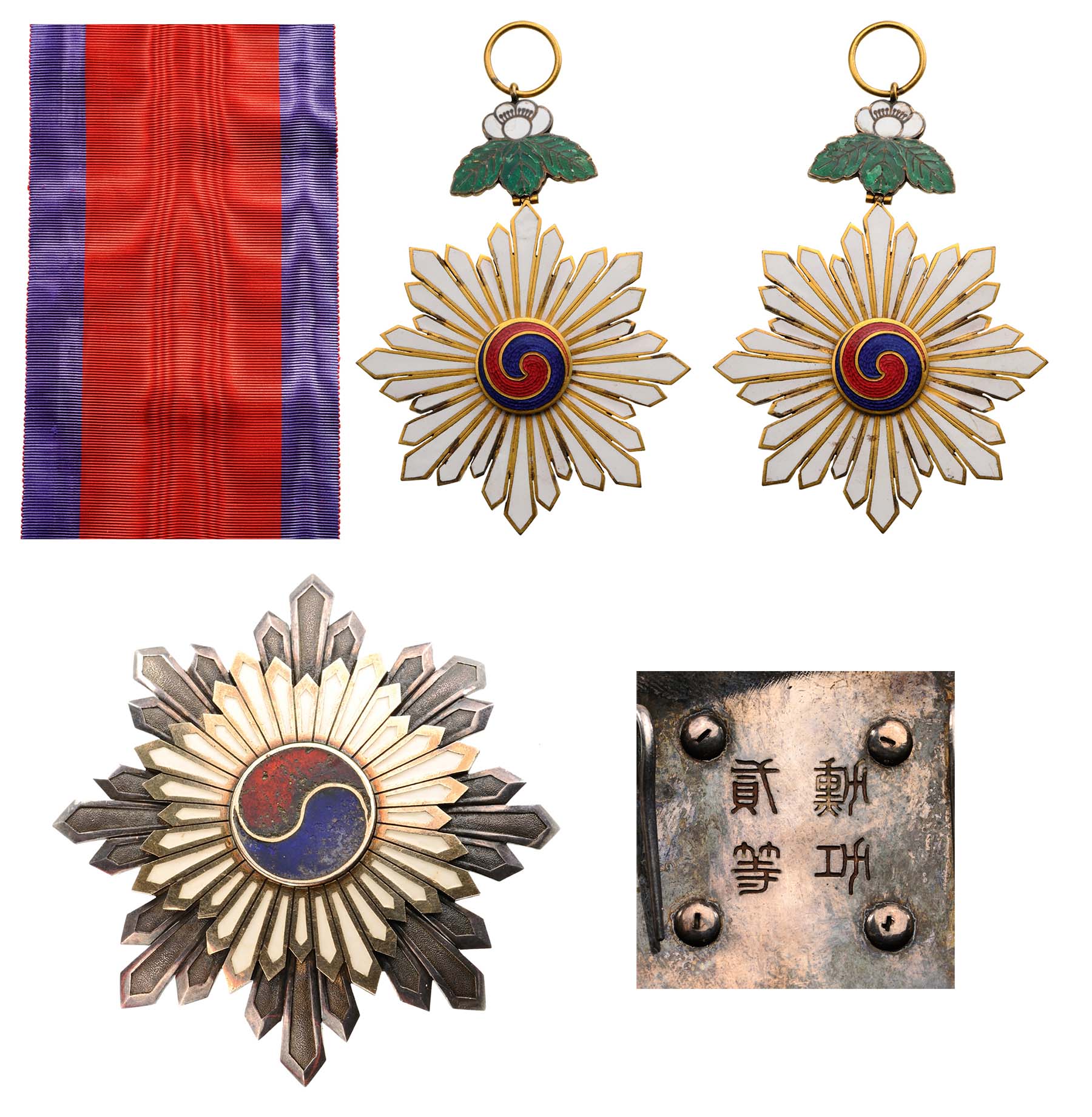 Grand Cross Set, 1st Class, instituted in 1900, in gilt Silver, 65 mm, both sides enameled, both central medallions gilt silver, enameled, floral suspension device and ring. Breast Star, 88 mm in Silver, superimposed parts gilt silver, enameled, central medallion gilt silver, enameled, reverse with vertical thin pin and two side hooks, inscriptions on reverse. A superb and extremely rare set! I RR!