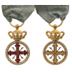 A Badge for Officials of the Order in Gold; the obverse as a red enameled cross of the Order with gold lettering, within round border of “diamond-cut” chiseled pattern with inner and outer, thin “roped” rim; the reverse with elaborate, finely done, engraved ornamentations; hinged crown of Royal type enriched with Bourbones’ fleurs de lys, large, round suspension ring and original, silk ribbon.