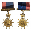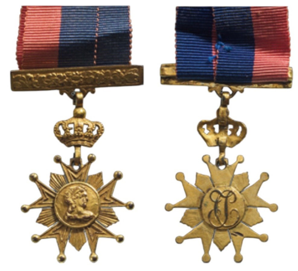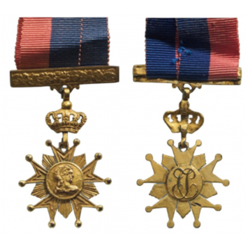 In gilt Bronze, five-armed cross with ball-finials flanked by beams; obverse centre medallion with embossed portrait of the Lady; smooth reverse, the centre medallion, embossed with monogram “JC”; on top, uniface Royal crown, broad, horizontal suspension bar embossed with oak leaves; original, silk ribbon.