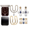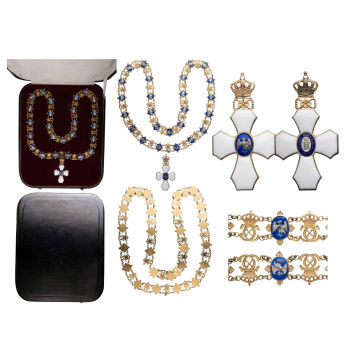 A Grand Collar Class of the Order, 1st type (1921-1944) in gilt Silver, composed of 25 crowned „CX“ Royal monograms of the Danish King Christian X and 25 blue enameled, oval medallions bearing the white enameled white sea falcon, all linked by small rings; to the centre falcon-link the Order‘s badge is appended as a white enameled cross with „cut“ corners to the arms; sea-blue enameled centre medallion bearing the embossed silver sea-falcon; oval, white enameled reverse centre medallion bearing the crowned monogram „CX“, within blue enameled outer circlet bearing the inscription „FYRSTI DESEMBER 1918“ (the date of the creation of the independent State of Iceland, under the Danish Crown); the cross‘s upper arm, with a stylized flower and branches linked to the Royal crown, its orb as the suspension loop; in its original, black leather presentation case, with wine-red velvet, fitted inner compartment and ivory, moirée silk, lid‘s inner cushion.
