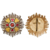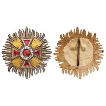 An early, embroidered 1st Type Grand Cross Star. Breast Star, 103 mm., Silver rays made of thin, narrow silver-strip, the centre, made as the Order’s cross, made of sheet-silver, partly lacquered of red, bordered with gold wire, red lacquered centre medallion, with golden monogram “FIA” (Franciscus Imperator Augustus), white enameled outer circlet, bearing the Order’s motto “INTEGRITATI ET MERITO” in black lettering, the arms, flanked by beautifully chiseled oak leaves, made of gold, the reverse with original backing and a long hook made of brass wire, to affix the star to the habit, allowing an easy removing of it.