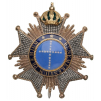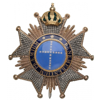 Grand Cross Star. Breast Star, 87x65 mm., GOLD, with five, gold-bordered arms, flanked by polished, golden beams; sky-blue enameled centre medallion, with a cross of silver, tiny five-pointed stars, dark blue enameled outer circlet with golden inscription “BENEMERENTIUM PRÆMIUM” and three rosettes with stylized leaves, the upper arm with superimposed, Brazilian Imperial crown with engraved and chiseled details, the reverse, fitted with vertical pin.A beautiful, old, spectacular and very rare star of this Order, excellent condition.I RR!