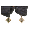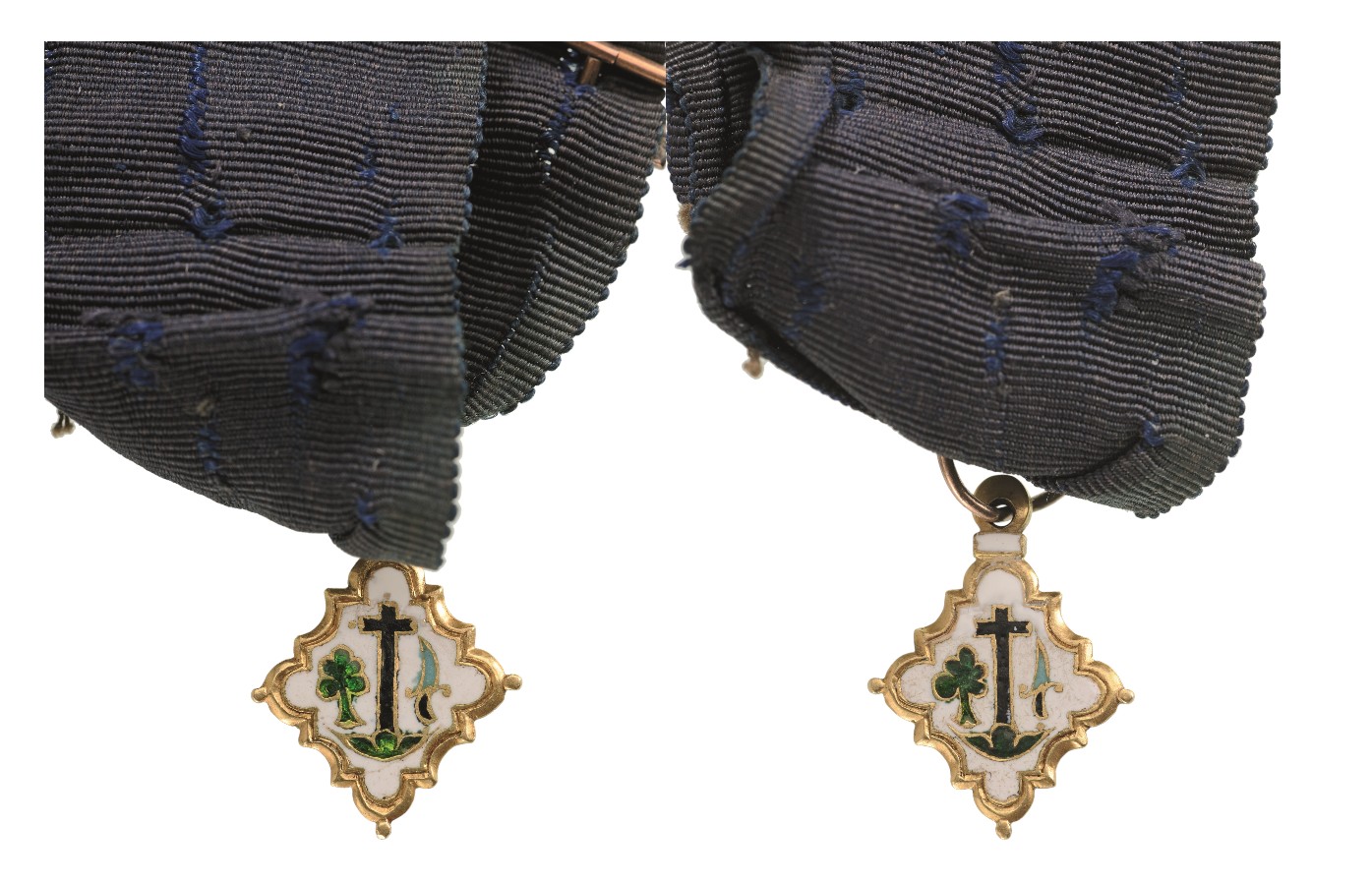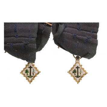 Reduced size, in Gold with ornamented border, both sides with white enameled field with black enameled Christ’s Cross, sided by green enameled branch and a sword with blue enameled blade and brown enameled grip; flattened suspension loop, round ribbon ring and original, dark green ribbon with rectangular, golden buckle with engraved inscription.