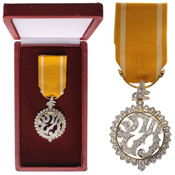 Awarded in the years BE24792559 (19462016 a.D.), a First Class Breast Badge, in Gold, with the Royal cypher within circular, ornated border, profusely set with brilliants; ornated suspension, ribbon-ring and original ribbon; in its original case with wine-red, inner compartment.